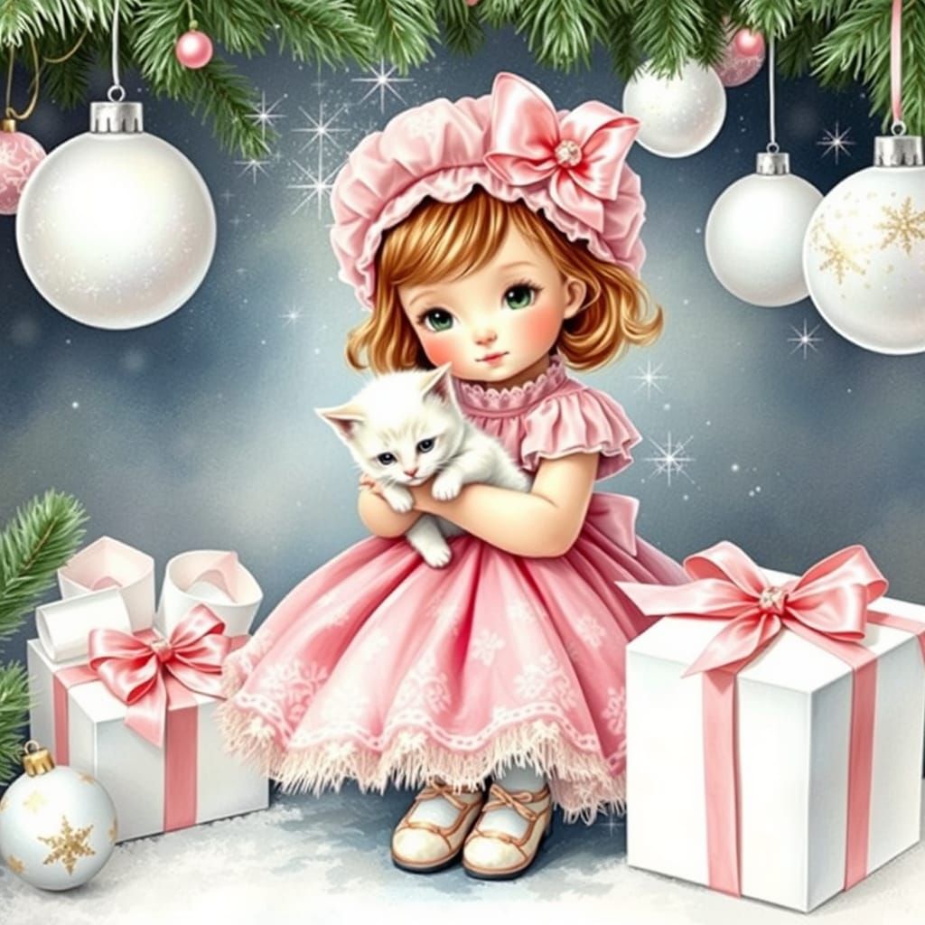 A watercolor-style image of a young girl in a pink dress holding a kitten amidst Christmas decorations. The artwork evokes a highly detailed, sparkling and festive aesthetic.