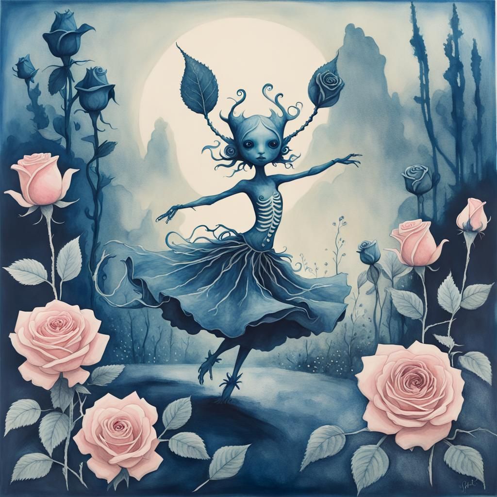 A cyanotype landscape featuring a whimsical monster dancing among roses. The image evokes a surreal and ethereal atmosphere. The artwork has elements of modern surrealism.