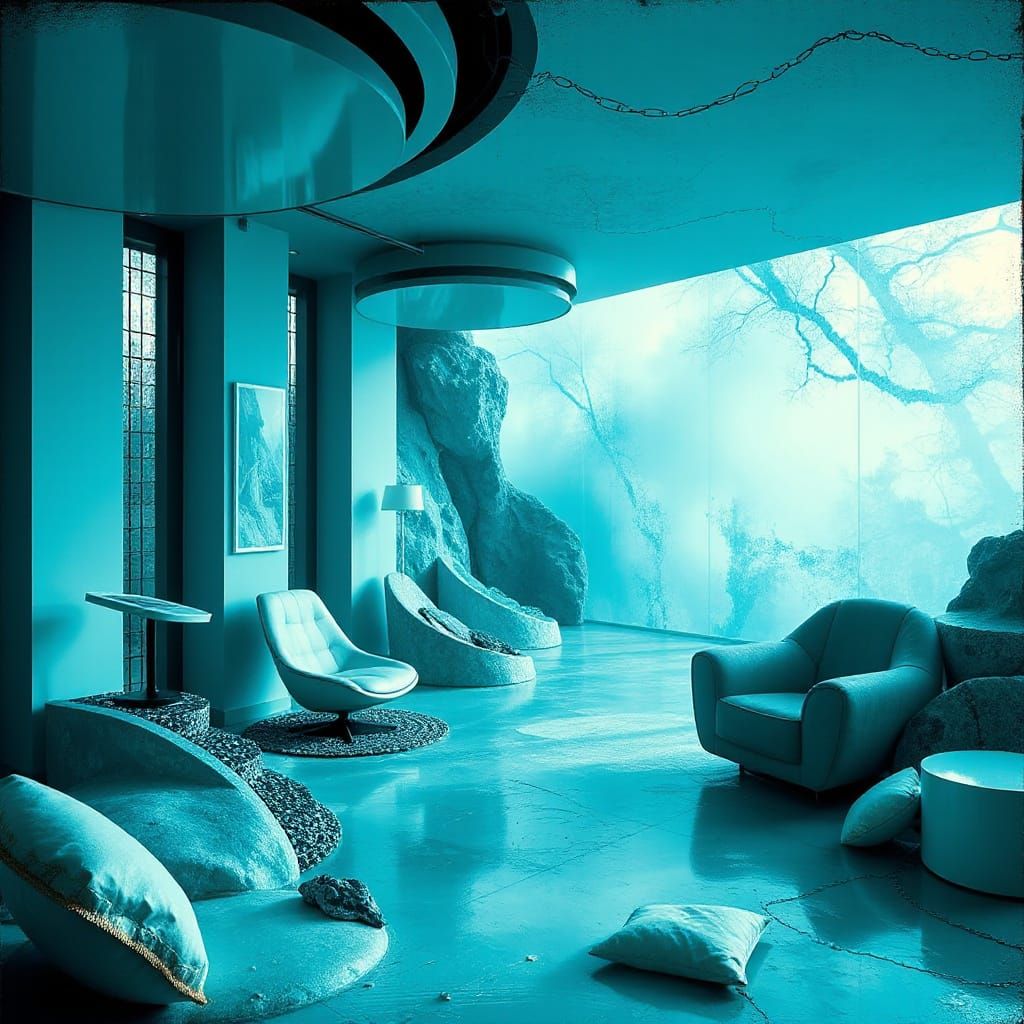 This abstract surreal image features a deluxe teal and blue color palette, creating a steamy and dreamlike visual experience with unique artistic elements.