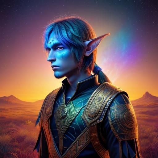 This image shows a regal elven prince with native American features, depicted in a vibrant holographic style. The artwork blends cosmic and astral elements in a mixed media illustration.