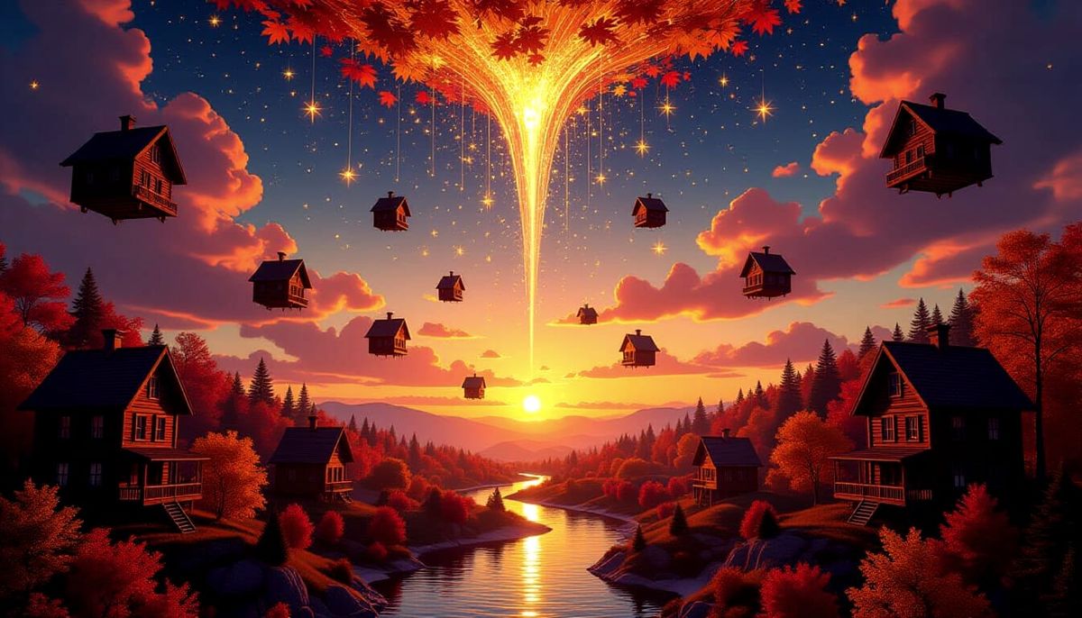 This image depicts a surreal autumn night with cabins floating upside down in the sky. Angelic trees and falling stars fill the scene, with a golden river overhead.