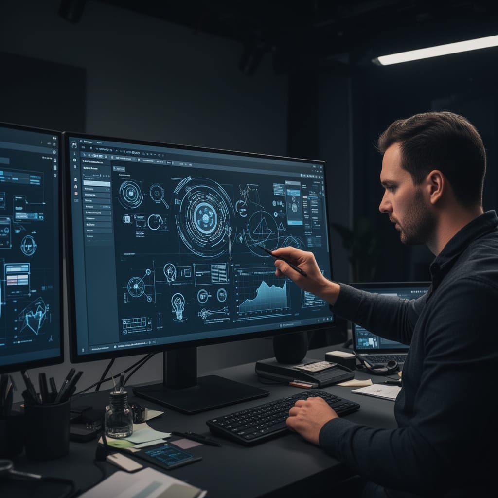 This image shows a hyperrealistic computer on a subway platform, captured with intricate details, high contrast, and cinematic lighting for a moody atmosphere.