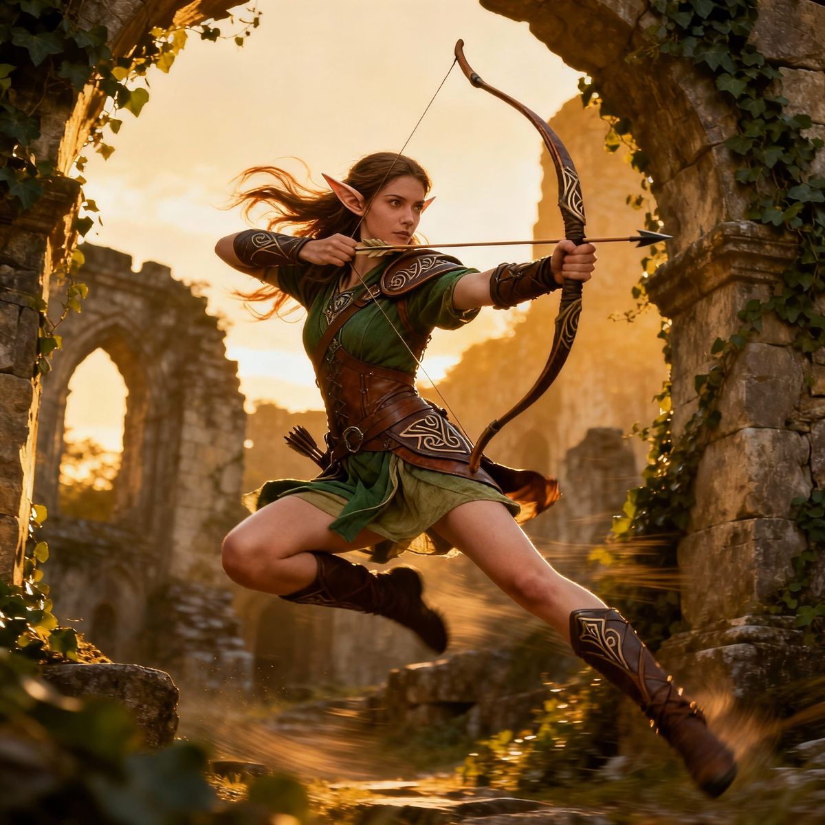 A dynamic action image of a female elven archer captured mid-leap as she takes a shot, showcasing agility and precision.