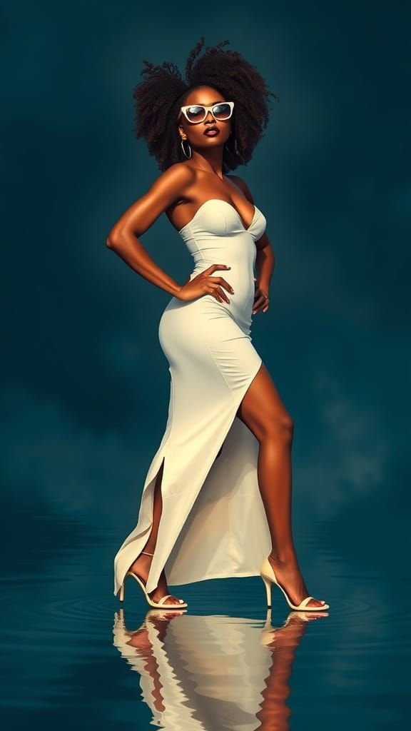 This image shows a black woman with an afro, wearing a white dress and heels, standing confidently by a reflective pool. The artwork features a blend of realism and vibrant hues.