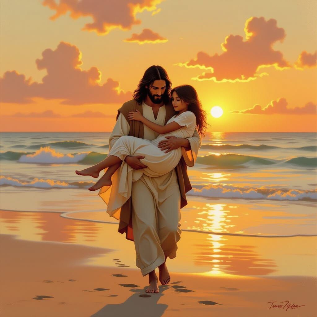 A serene image of Jesus Christ carrying a girl on a beach during sunset. Warm light illuminates gentle waves, rendered with soft brushstrokes and vivid colors in a realistic style.