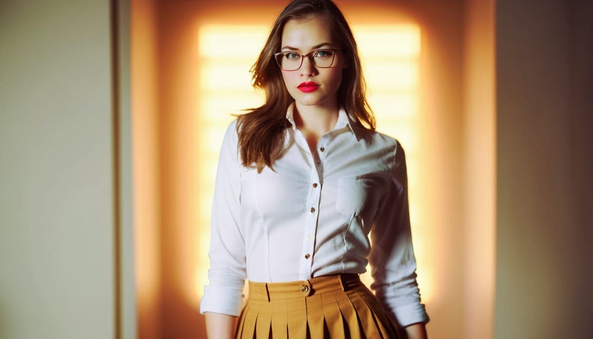 This image captures a young adult woman in a romantic, soft-focused medium shot. She wears a micro skirt and an open button-down shirt, exuding a sensual and flirty atmosphere with bright lip color and warm, golden tones.