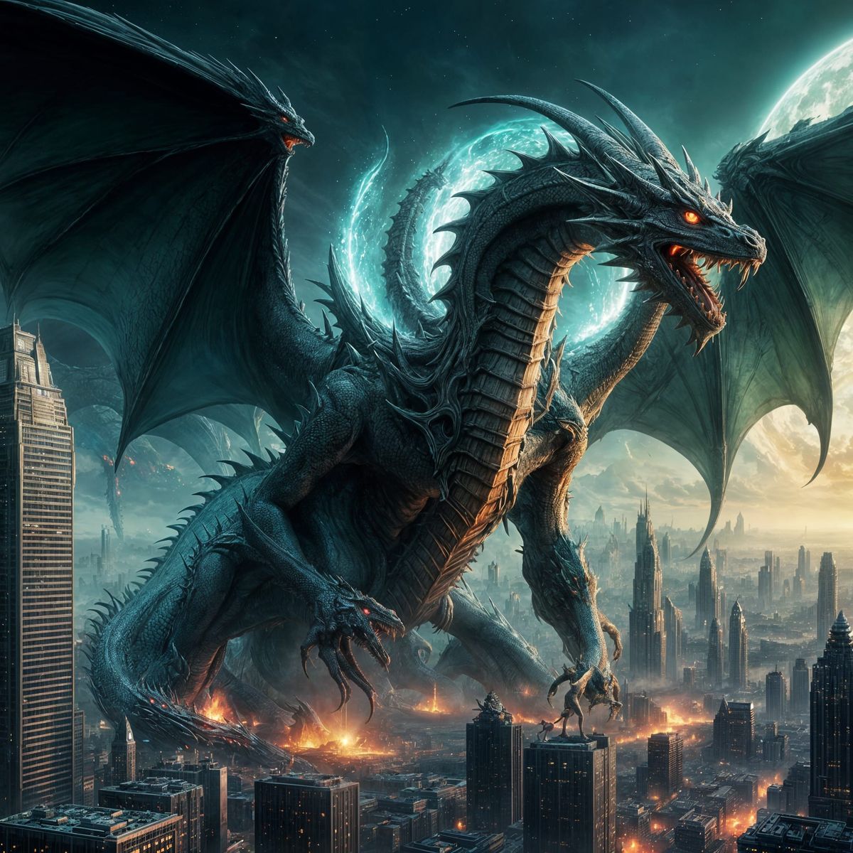 This image shows a gigantic, glowing dragon attacking a city of the future. Green fire pours from the dragon's mouth, destroying buildings amid bright neon lights in a bioluminescent and hyperrealistic digital art style.