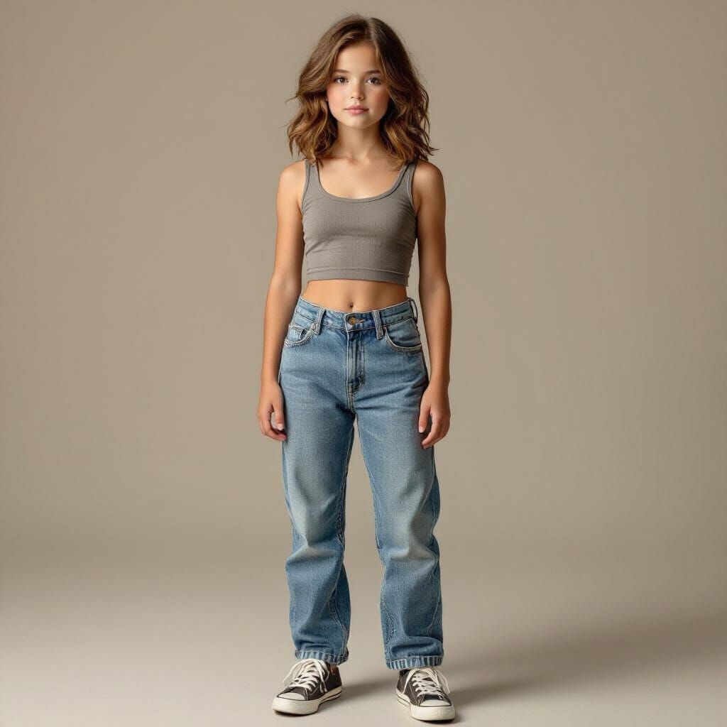 This image shows a short girl with wavy brown hair, wearing a modern crop top, jeans, and sneakers. The full-body shot uses natural lighting and subtle textures in a realistic style.
