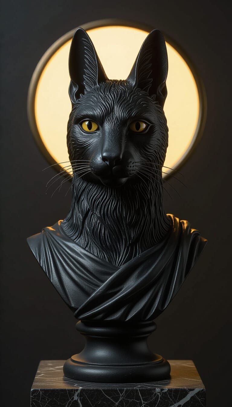 A striking picture of a realistic classical deer sculpture with matte black fur. Inspired by Greco-Roman sculpture, it features symmetrical facial features, defined muscles, and modern gold glasses. The image is cinematic with dramatic lighting.