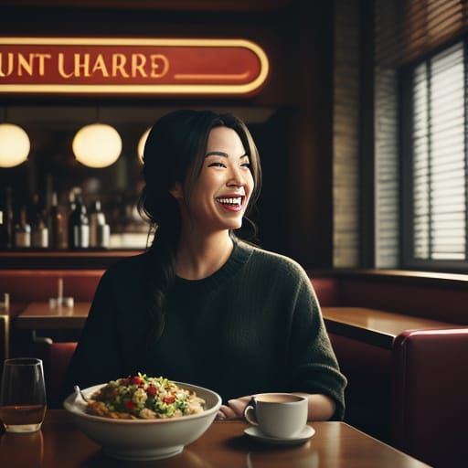 This image captures a woman laughing in a restaurant, presented as a realistic, atmospheric photograph with cinematic lighting and film grain. Shot in stunning 8k resolution.