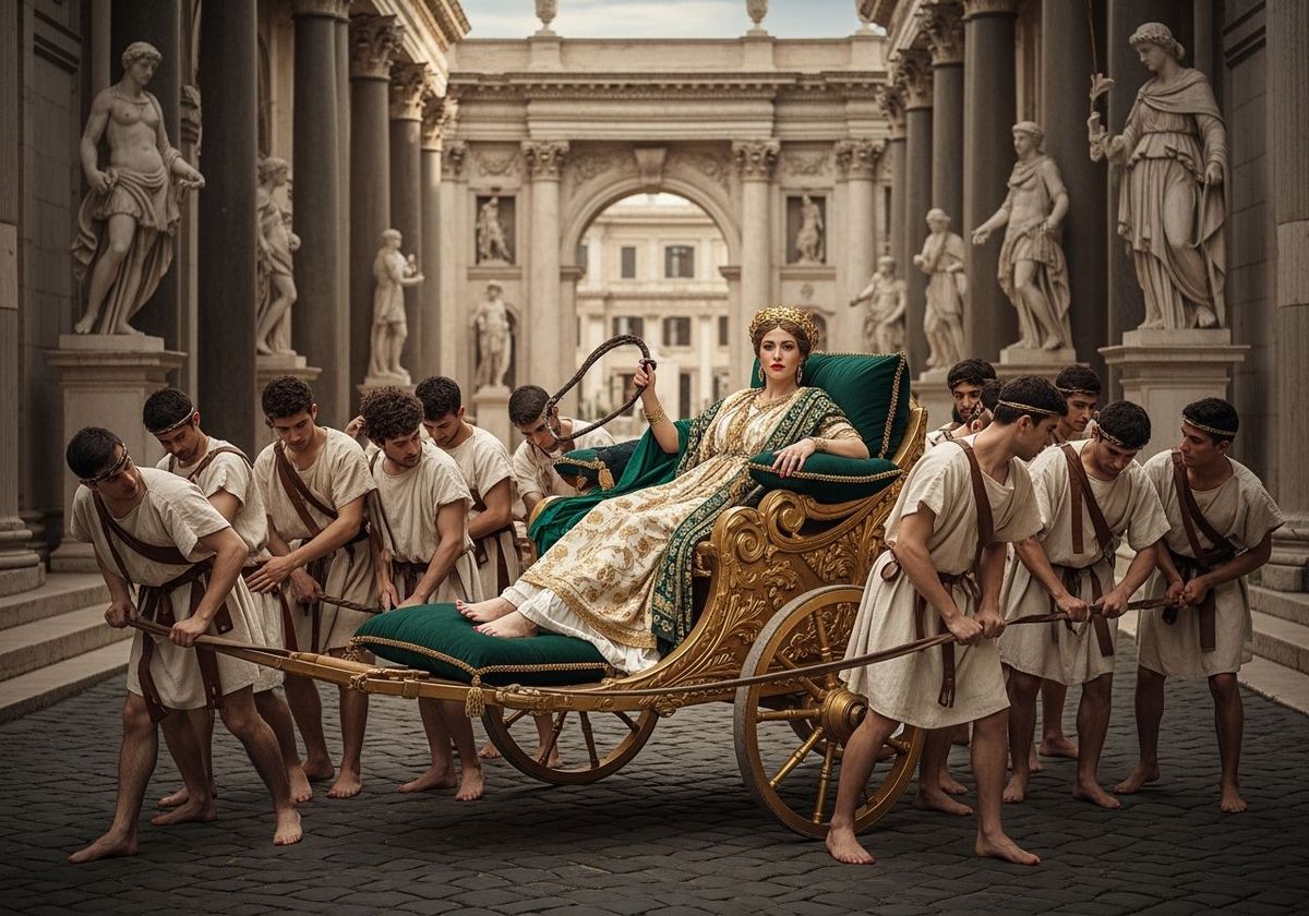 This image shows a Roman Empress in a gold and emerald toga, reclining on pillows in a golden chariot. The scene, reminiscent of old master paintings, features barefoot servants and a backdrop of ancient Rome.