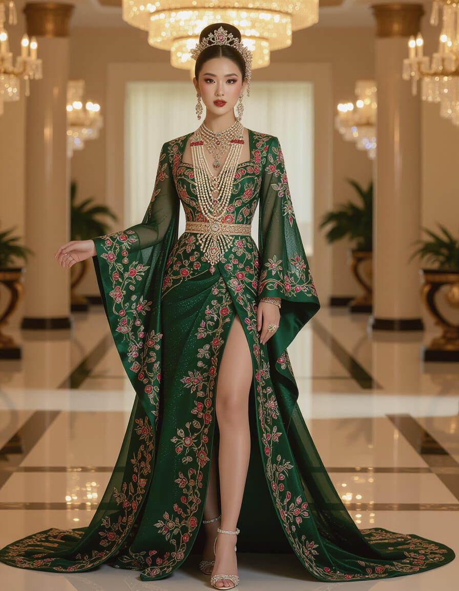 A hyper-realistic portrait of a beautiful East Asian woman in a luxurious, jewel-toned dress and intricate jewelry. Cinematic lighting highlights her elegance and regal beauty.