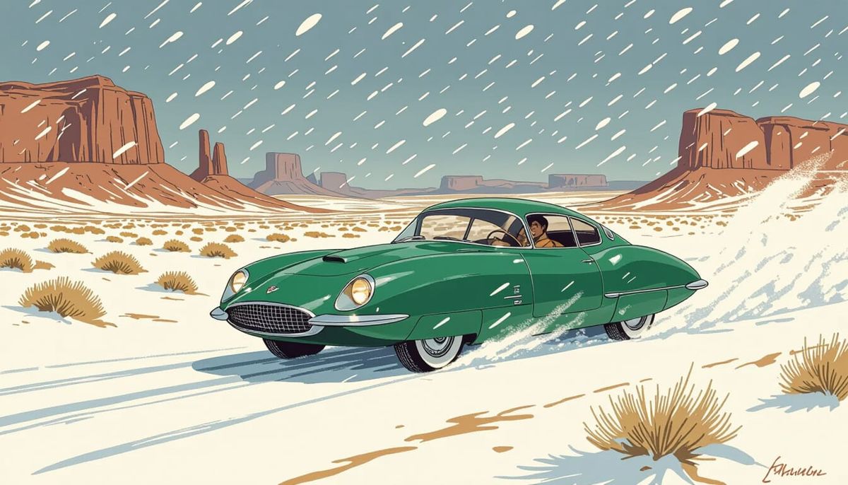 A surreal image shows Buckminster Fuller's Dymaxion car driving through a snowstorm in a desert. The whimsical, illustrative style evokes a mystical atmosphere with intricate linework.