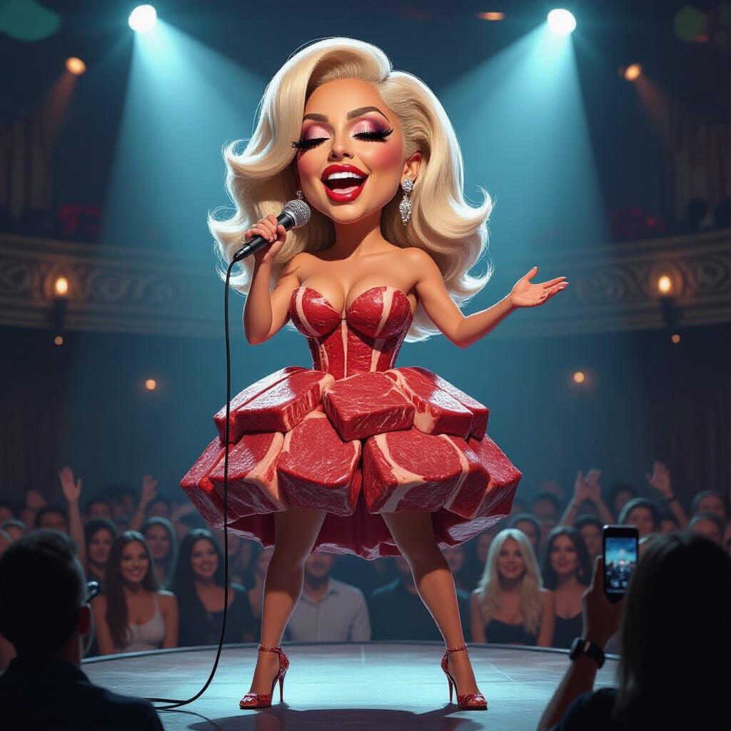 This image features a caricature of Lady Gaga performing live in her iconic meat dress. The scene is detailed with a dilapidated background, dramatic lighting, and rich colors, presented in UHD resolution.