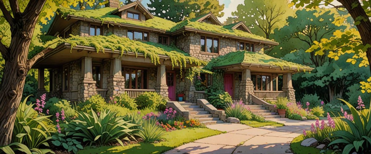 A cheerful comic book image of a stone prairie-style house surrounded by a lush victory garden. The scene is bathed in warm afternoon sunlight with soft green and pink hues, reminiscent of Ghibli.