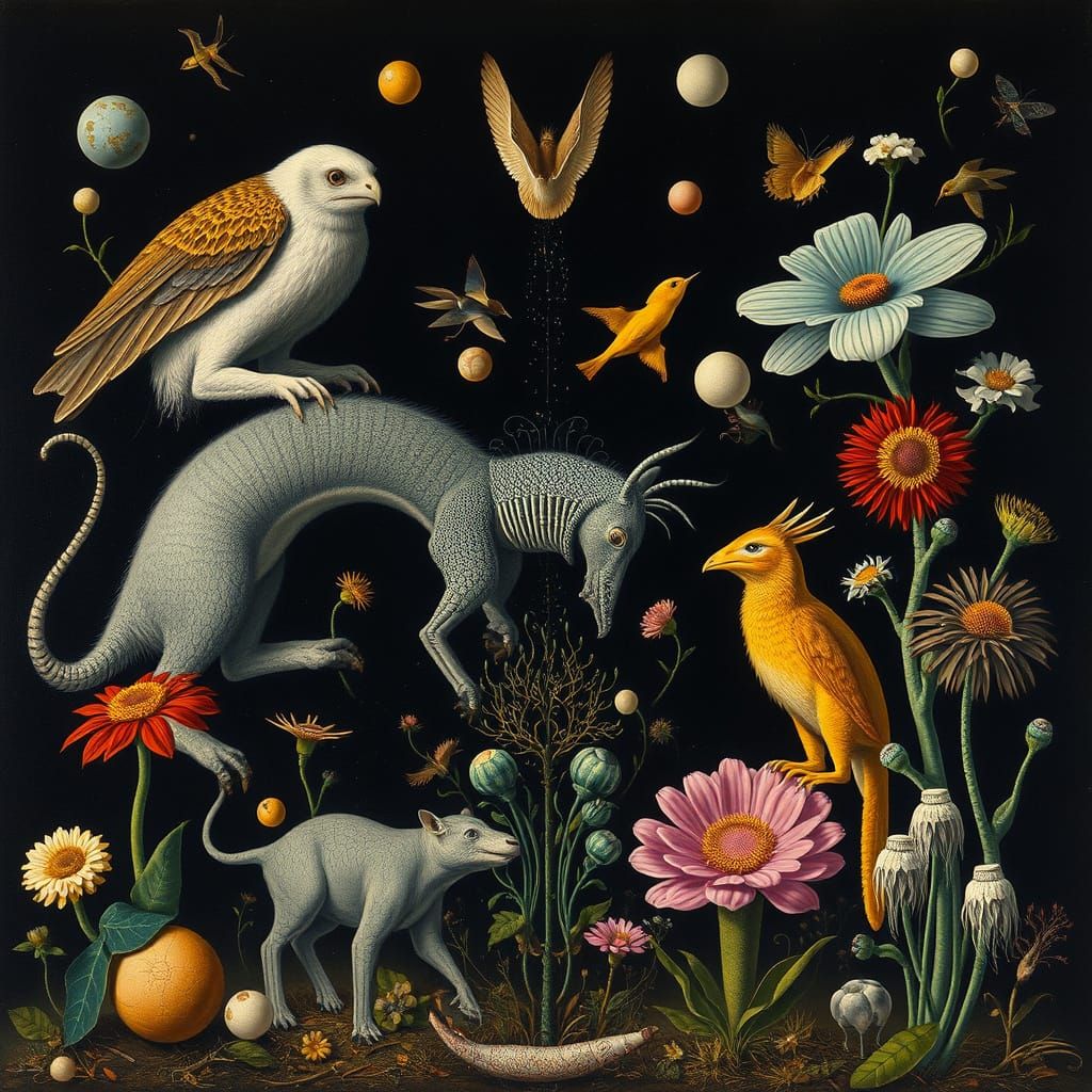 This image shows a surreal composition featuring bizarre, harmless animals and strange plants. The artwork evokes surrealist painters through asymmetric compositions and fantastical elements.