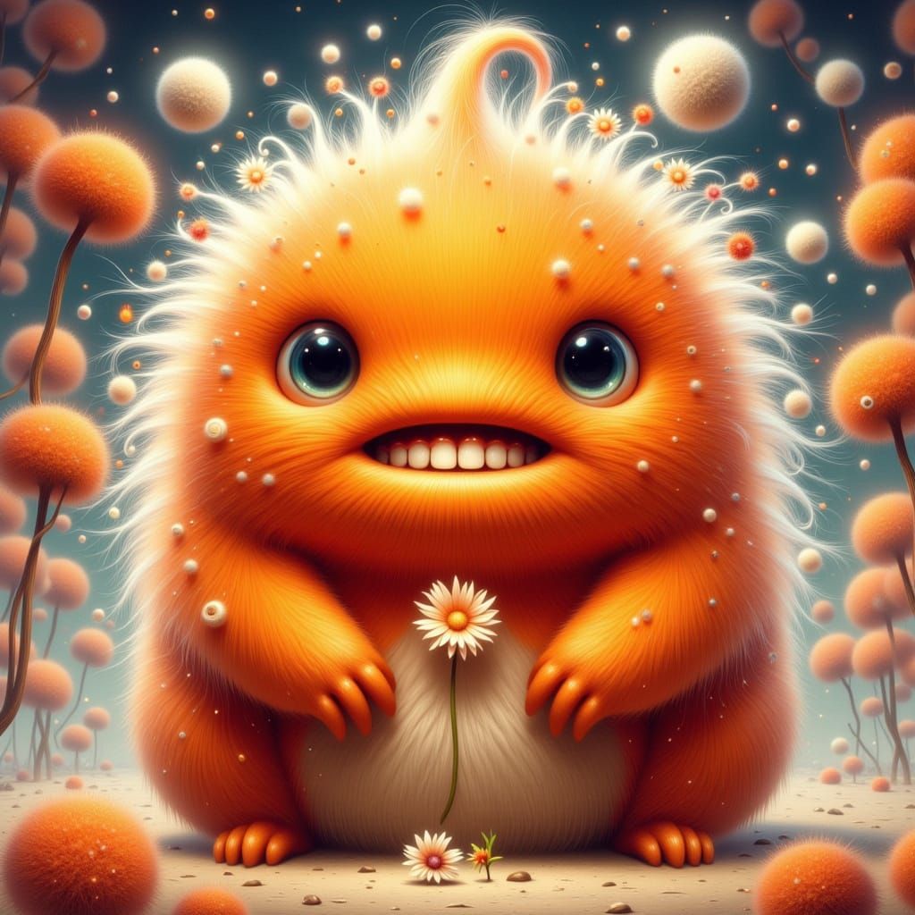 This enchanting image features a lovable orange monster surrounded by soft fur, posed in a playful environment with exaggerated shapes and colors reminiscent of fantastical worlds and quirky street art. Blending innocence and edginess, the style is reminiscent of children's book illustrations and surreal...