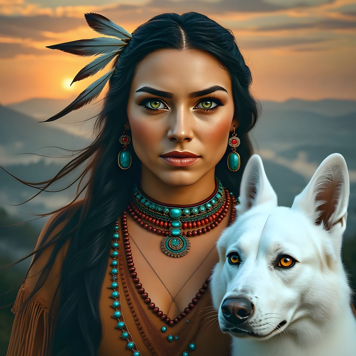 This image shows a Monacan woman in traditional deerskin clothing and copper jewelry. The portrait captures her strength and wisdom, with mountains and mist in the background, alongside her albino Carolina dog. The image is hyperrealistic with rich textures.