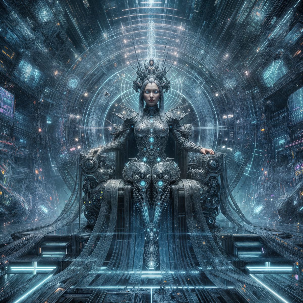 A majestic, Asian warrior queen sits on a futuristic throne, surrounded by shimmering digital code and blue neon lights. This elaborate digital painting combines cyberpunk and Victorian elements in a dystopian world, exuding grandeur and cinematic flair.