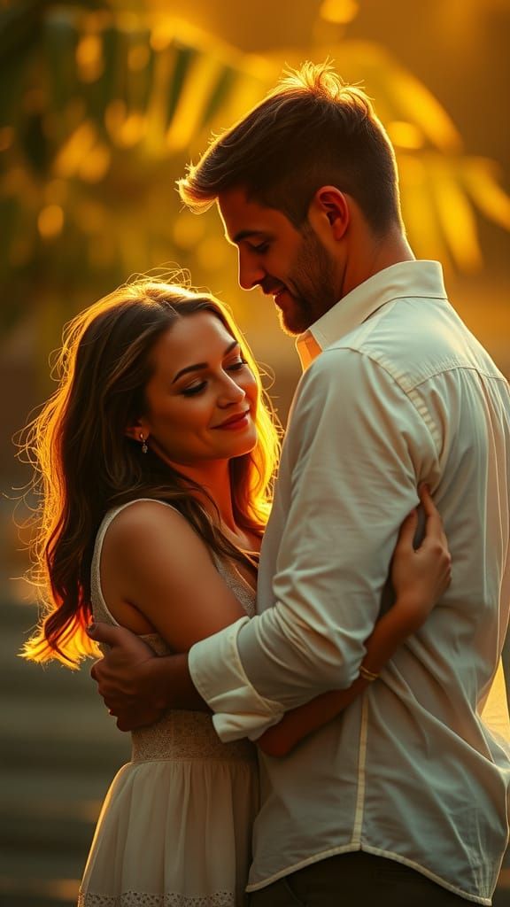 This image shows a romantic couple embracing in warm, golden light. The scene evokes a cinematic feel with film grain and subtle vignette, enhanced by color grading for a dramatic effect.