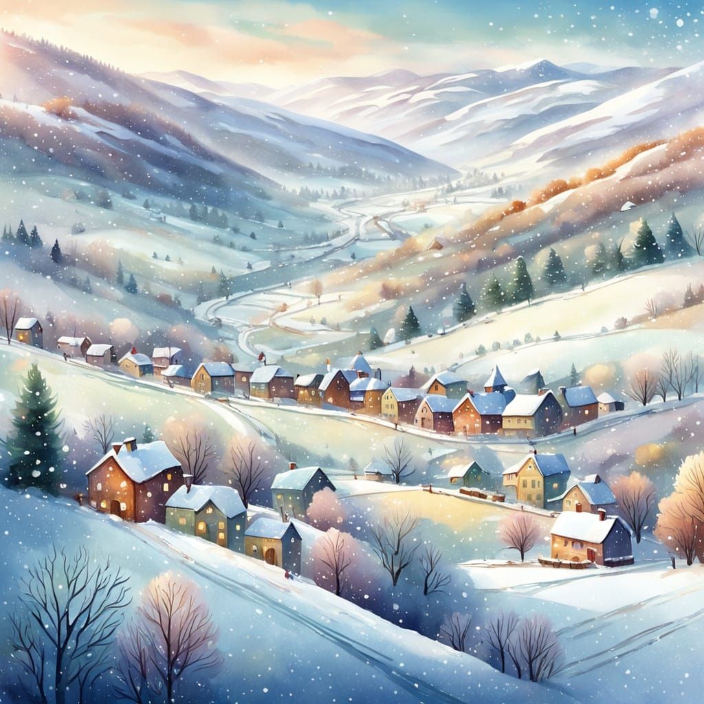 This image shows a snowy village nestled in a valley, captured from an aerial perspective. The scene is rendered in a whimsical watercolor style, enhanced by soft lighting and vibrant colors.