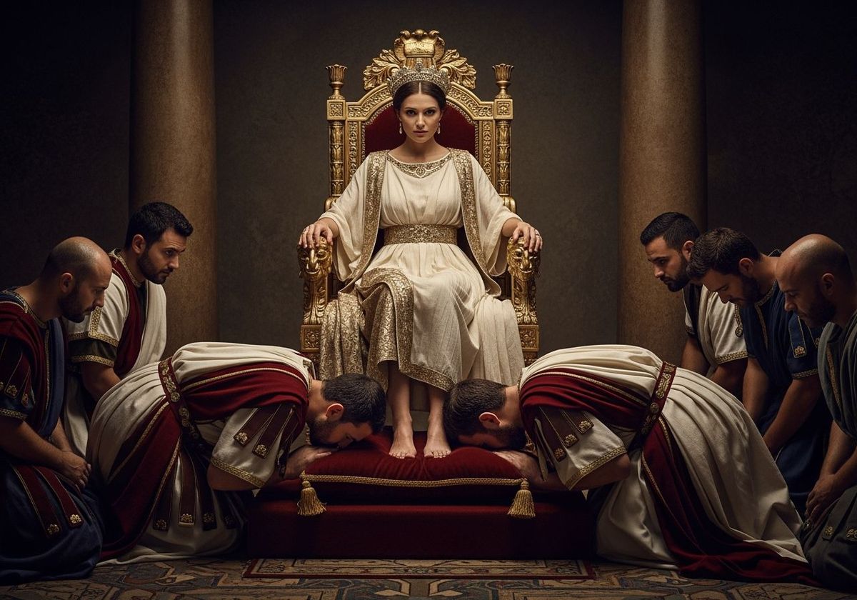 This image shows a Roman Empress in elegant attire, seated barefoot on a golden throne. Seven senators kneel before her, one kissing her feet, captured in sharp focus with a professional bokeh effect and natural lighting.