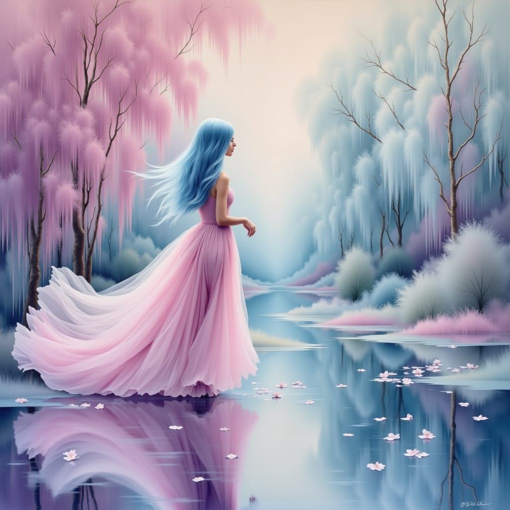 This image shows an ethereal nymph with sky-blue hair in an ice-pink organza dress by a misty lake with pink willows. Rendered in watercolour impressionism with volumetric lighting.
