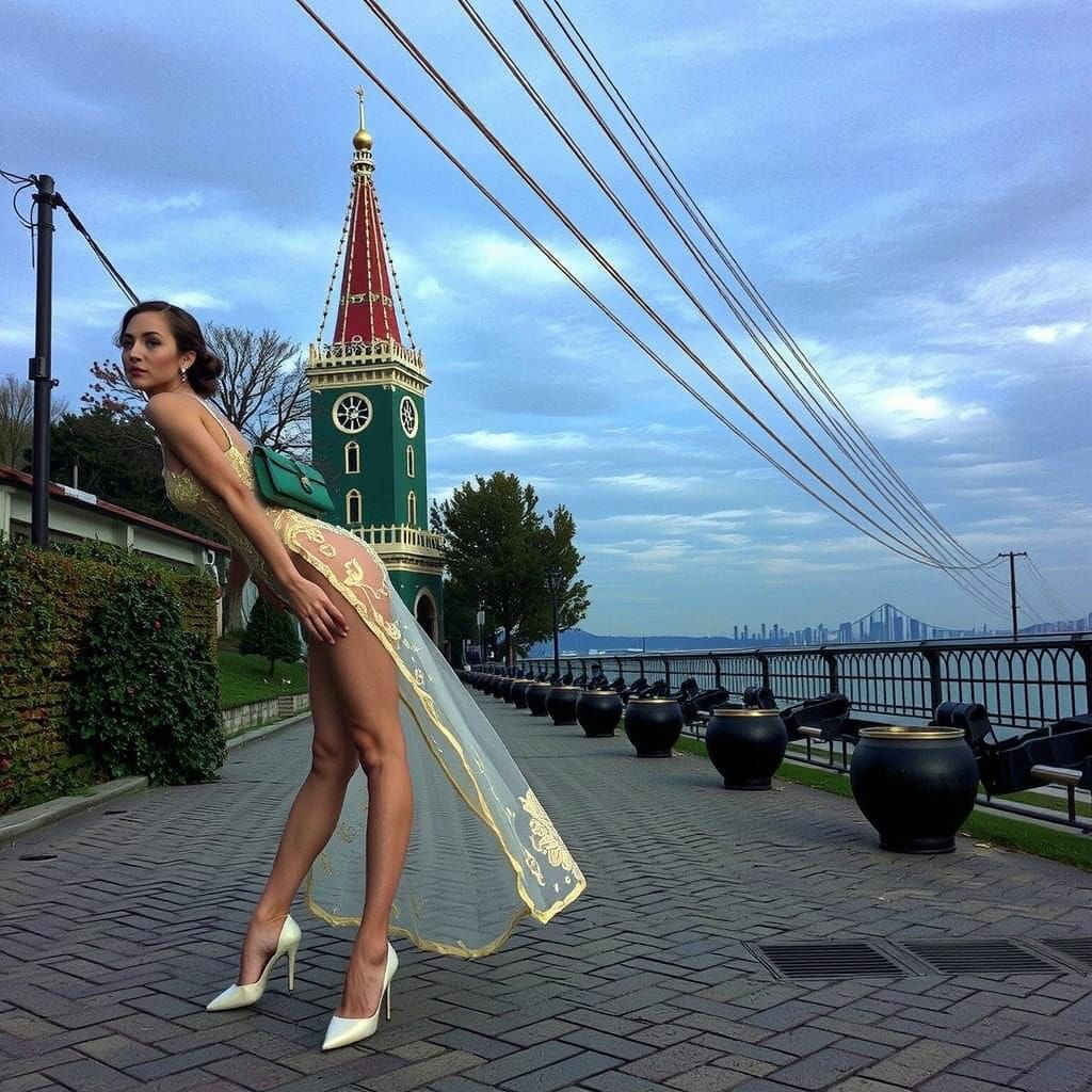 Murray ! Church and matching shoulder bag, with the longest ever legs almost as curved and as sinewy as the cables she stands beneath Beautiful. ML Ed 😉 😃