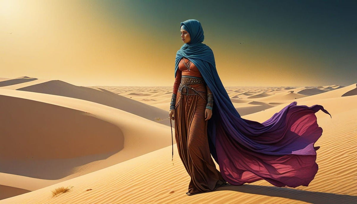A stunning watercolor painting of a Bedouin woman amidst a surreal, sci-fi landscape of sand dunes, characterized by bold, jewel-toned colors and an expressionist flair