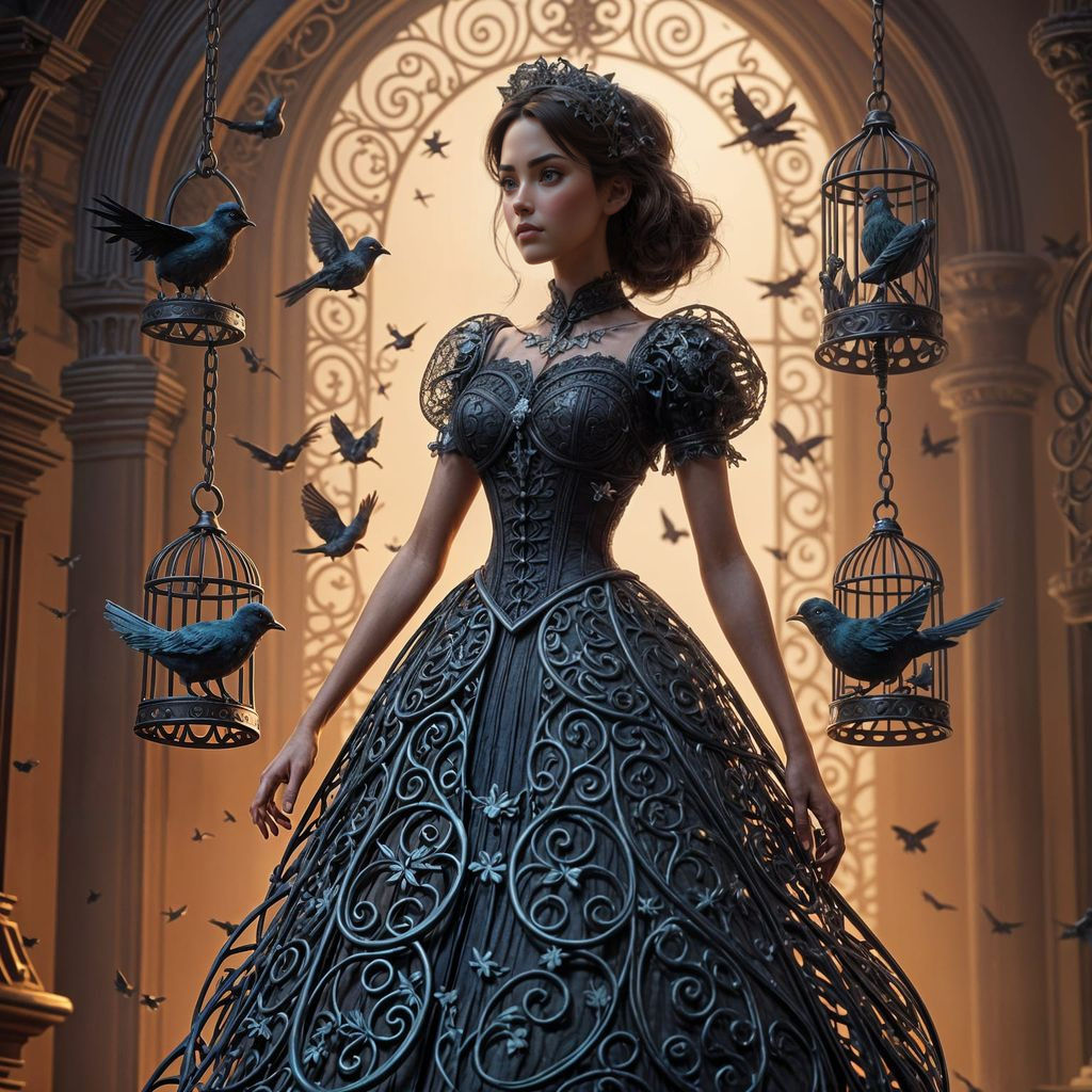 This image shows a woman's upper body seamlessly transitioning into an intricate wrought iron cage shaped like a dress, adorned with tiny birds. The artwork is rendered as 3D digital art.