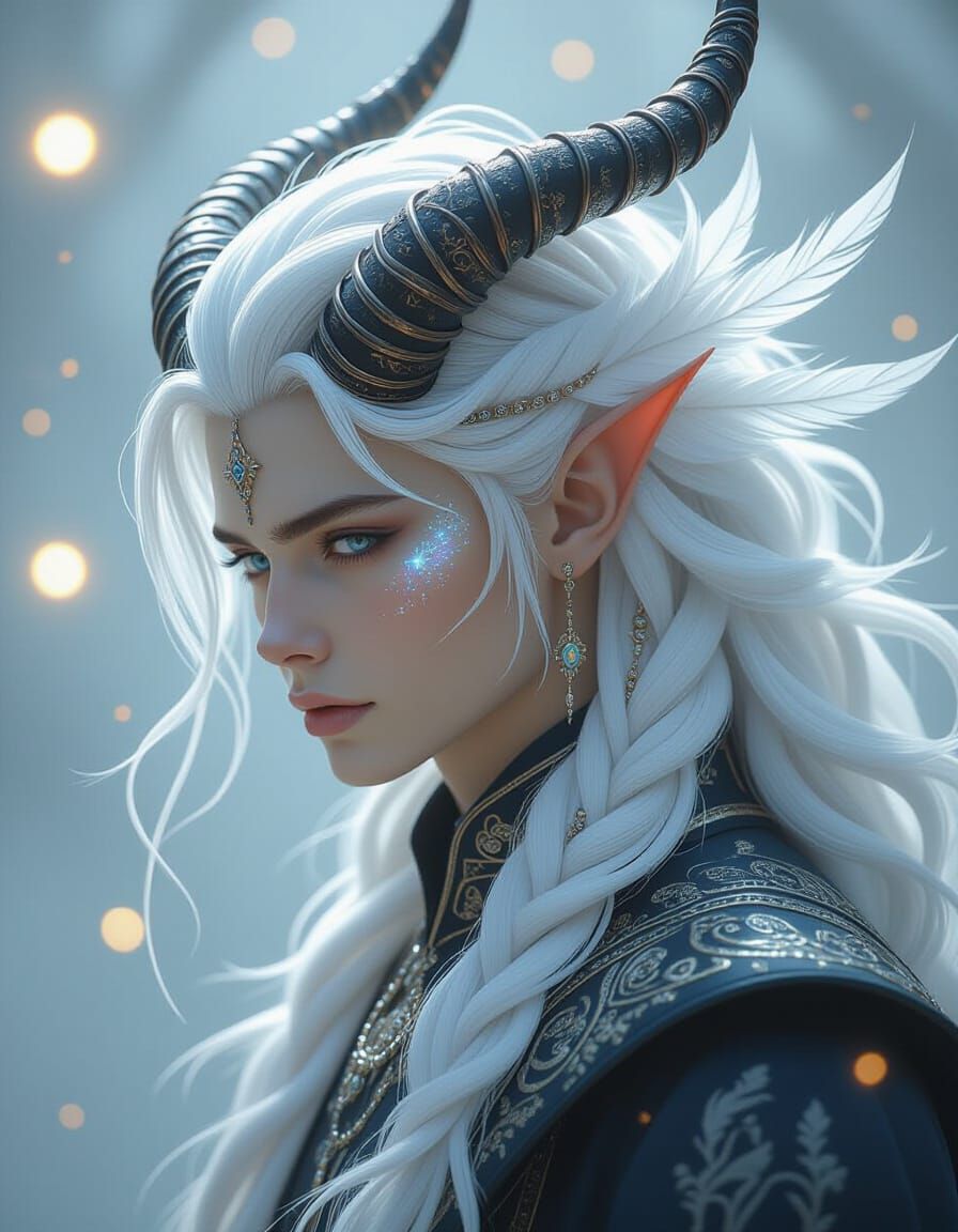 This image shows a majestic fantasy character with elaborate white horns and hair. The style emphasizes fine details and cinematic lighting, creating a breathtaking and magical atmosphere.