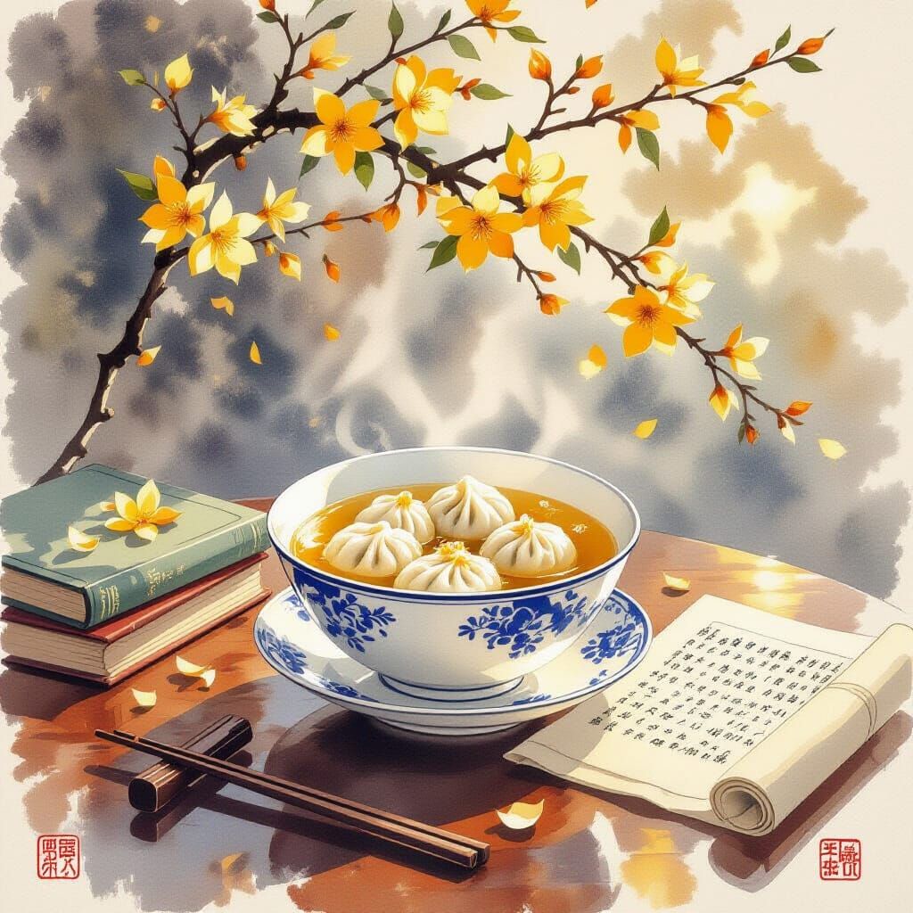A serene Chinese watercolor scene featuring a bowl of sweet rice dumplings in clear soup with osmanthus flowers, surrounded by ancient books and scrolls. The artwork evokes a dreamy atmosphere with soft focus and painterly textures.