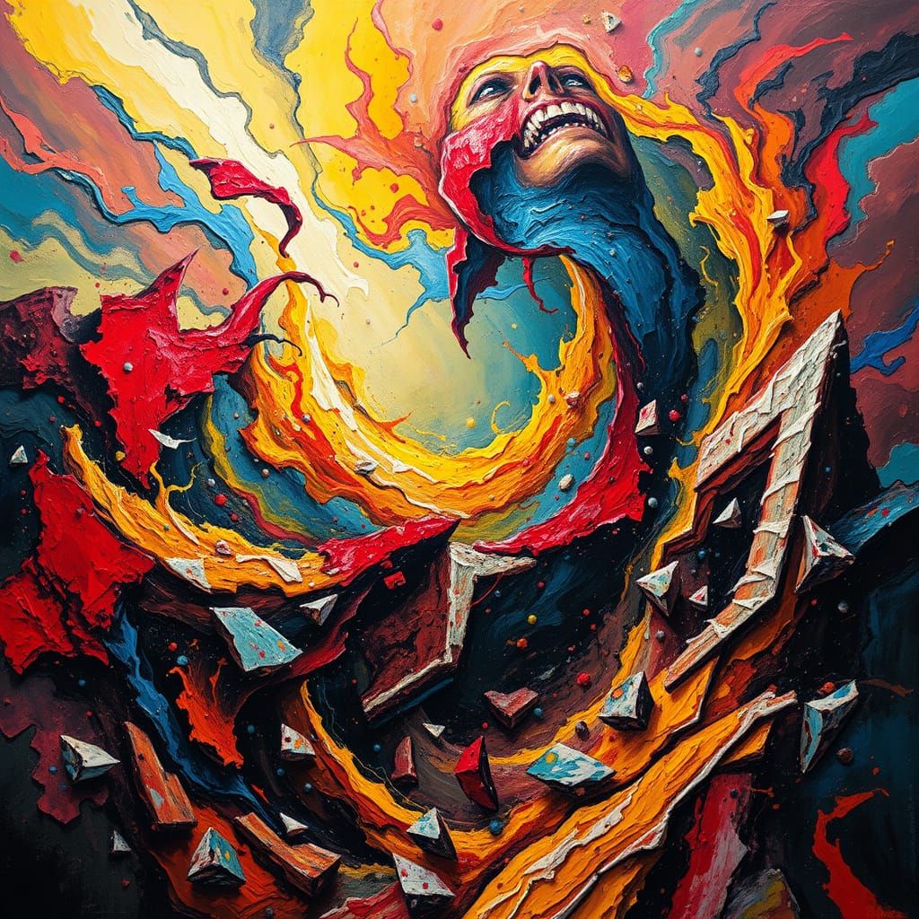 This image depicts a chaotic, surreal landscape representing intense emotions. Jagged forms and swirling, clashing colors like crimson and electric blue convey psychological turmoil in an abstract expressionist style.
