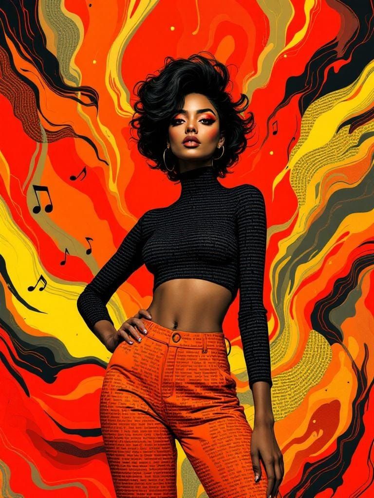 This image shows a confident woman in a dynamic pose, set against an abstract background with musical notes. The artwork features ASCII art overlays and organized textual patterns for heightened visual complexity.