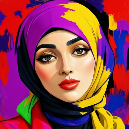 A close-up Fauvist portrait of a woman in a hijab, rendered with golden light, bold colors and dynamic brushstrokes on a vibrant abstract background. A striking image in the Fauvist style.