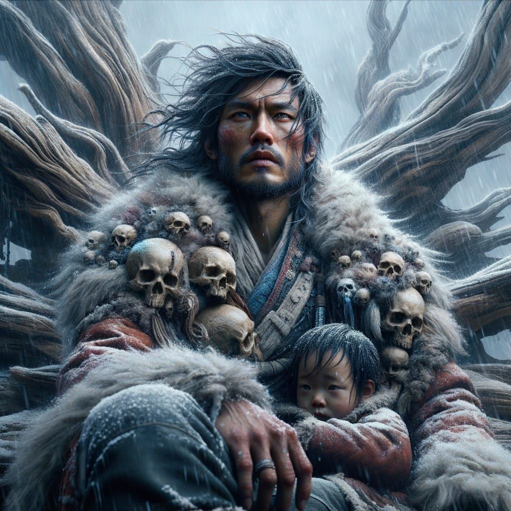 A fantasy king with rugged looks, adorned in a skull-decorated coat, holds a child beside a wooden throne. Rendered with rough brush strokes and rich texture in white, red, and ice blue tones, emphasizing a cold atmosphere.