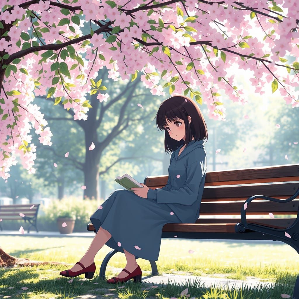 A peaceful image shows a woman reading on a bench beneath a cherry blossom tree. Soft sunlight filters through the leaves in this idyllic, tranquil scene in a Japanese-inspired style.