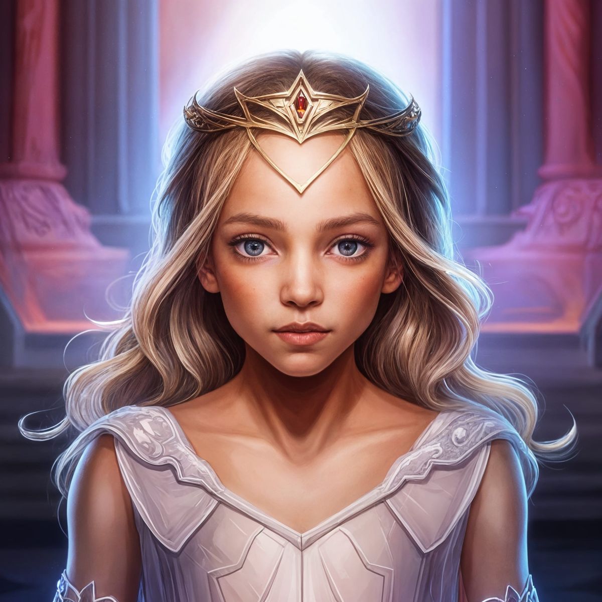 This image showcases a majestic, 8K resolution portrait of a young princess being crowned the new galactic empress, set amidst a regal throne room with triadic colors and dynamic lighting.