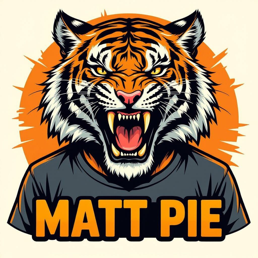 This image showcases a ferocious tiger head with sharp teeth, outlined in bold lines and rendered in muted earthy tones. It wears an oversized streetwear t-shirt featuring "MATT PIE" lettering, evoking a vector art style.