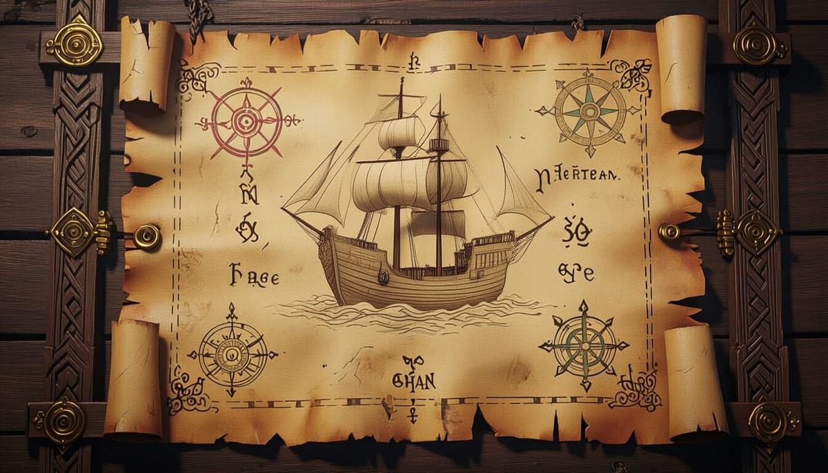 This image shows an ancient pirate map with worn leather, faded ink, and mystical symbols. Intricate wooden carvings surround the map, rendered as detailed digital artwork with deep shadows.