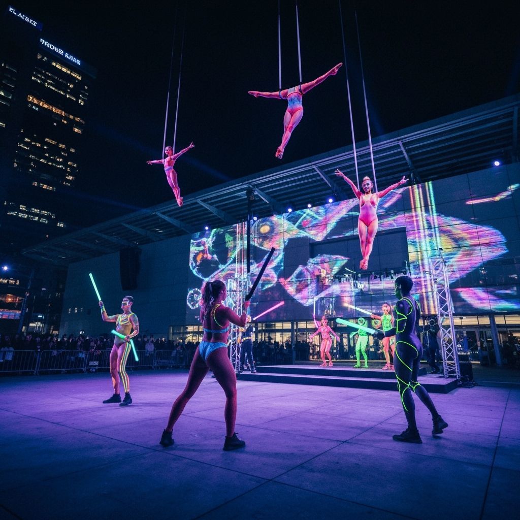 A nighttime view of a modern circus arena illuminated by vibrant LED lights. Futuristic performers in sleek costumes, aerialists, jugglers with glowing props, and dancers create dynamic motion in a digital art style.