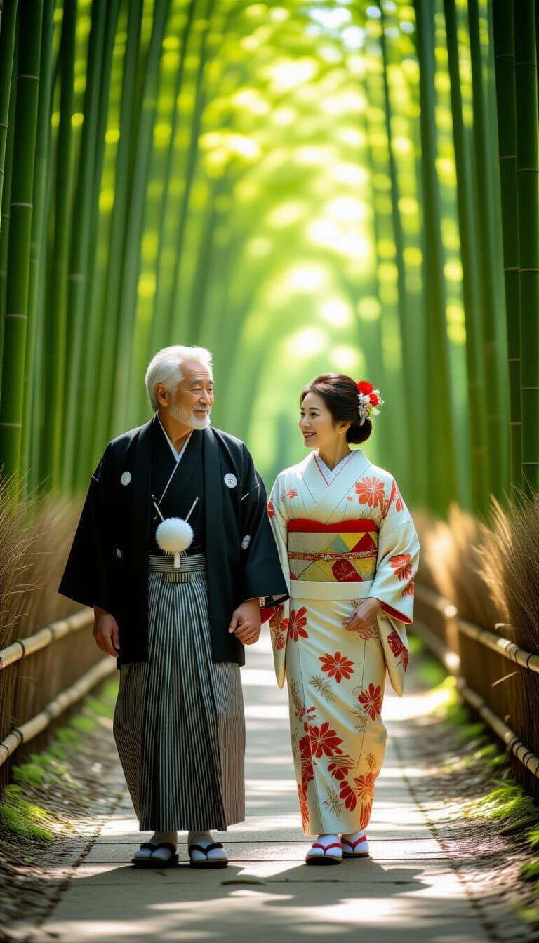 A realistic photograph of an elderly Japanese couple walking hand in hand through a bamboo forest. Soft sunlight filters through the trees, highlighting their natural facial wrinkles in a subtle color palette.