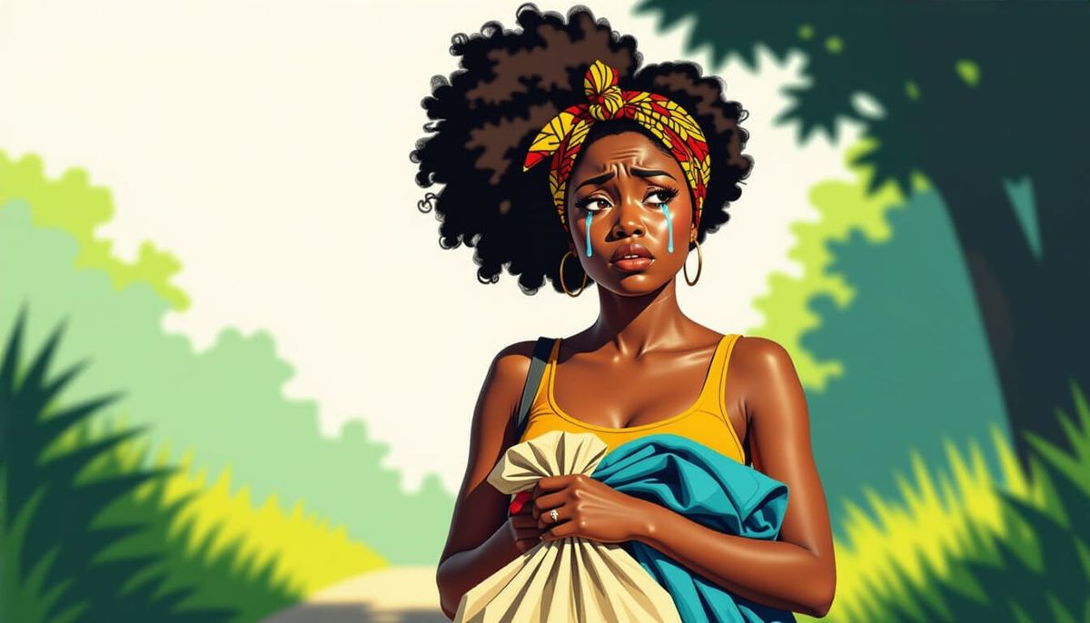 This realistic animated style portrait shows a young African woman with an Ankara-accented afro, clutching a bag of clothes. Tears stream down her face as she walks towards a dark forest, depicted with dramatic lighting and deep shadows.