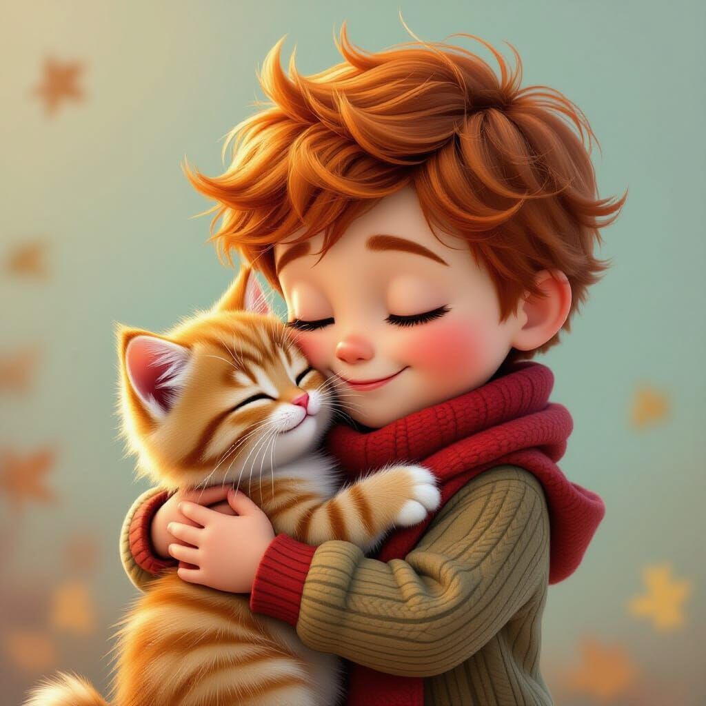 This image shows a heartwarming scene of a red-haired boy in autumn clothes kissing a ginger kitten, created in a soft, glowing Pixar animation style with rich textures.