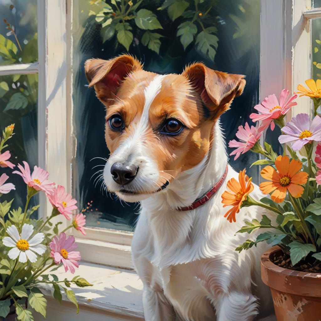 A watercolor painting of a Jack Russell Terrier at a window surrounded by flowers. The image showcases vibrant colors, thick brush strokes, and soft natural light in an impressionistic style.