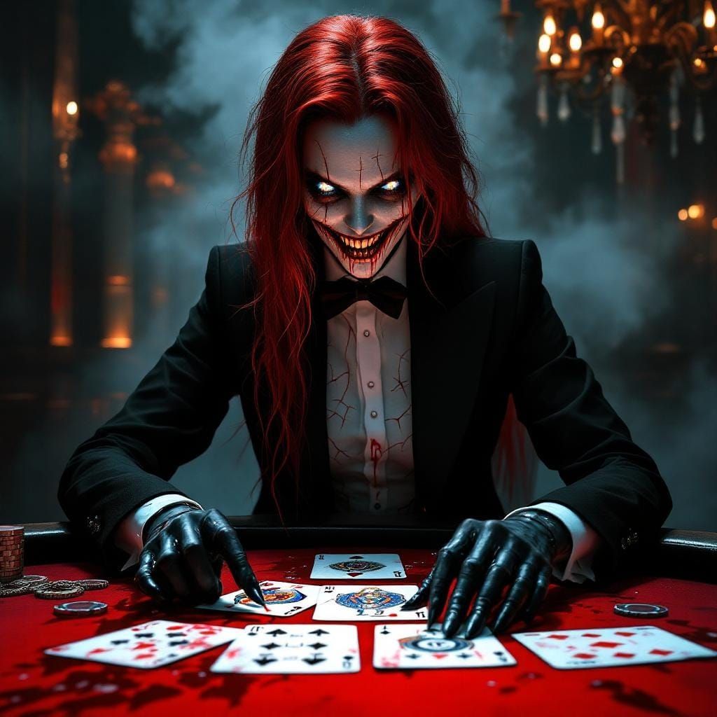 This image shows a terrifying woman with porcelain skin and glowing eyes dealing cards at a casino table. The scene features a hyper-detailed horror-fantasy aesthetic with dark, smoky undertones and glowing symbols.