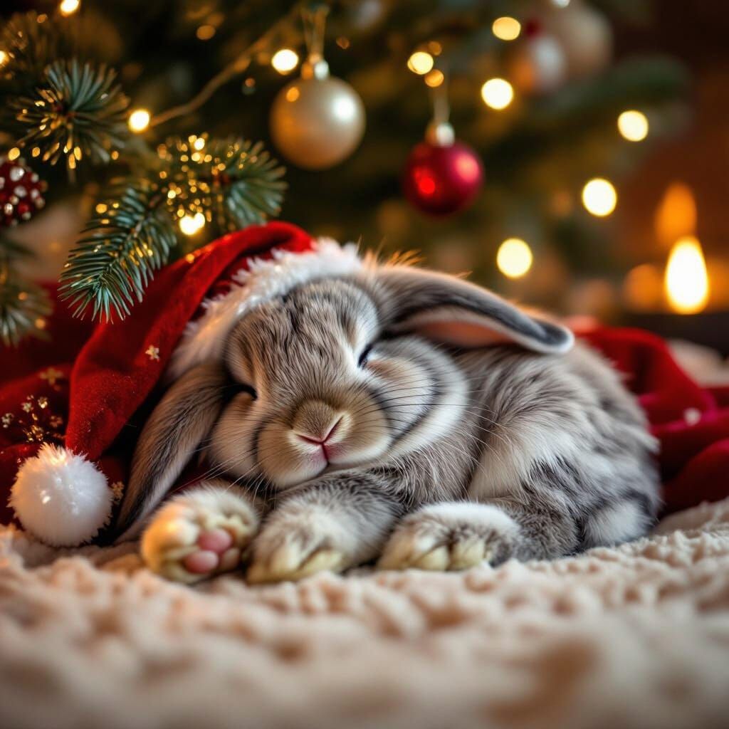 This image shows a photorealistic grey lop-eared bunny asleep under a decorated Christmas tree, with a foot visible by the fireplace. Captured with cinematic lighting, it evokes a warm, magical mood of anticipation.