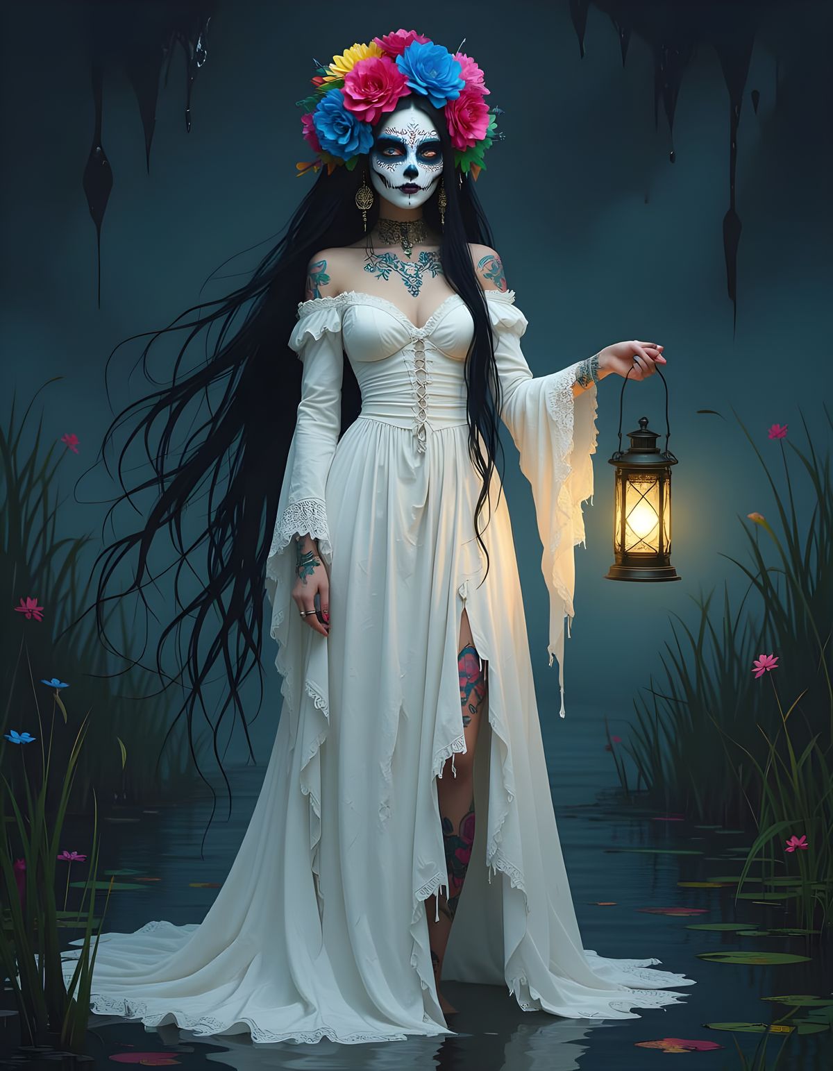 This image shows a tall, slender woman with long black hair adorned with blue and pink flowers. She wears a Dia de los Muertos-style face mask, pale skin, and wet, tattered white dress. A lantern glows in her hand amidst mist and a dark swamp background.