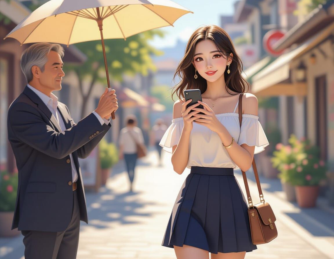 This image showcases a stylish Korean model in a mini skirt and chiffon top, walking down a sunny street while using her phone. An older man respectfully holds a parasol to shade her, as 3D rendered digital art.