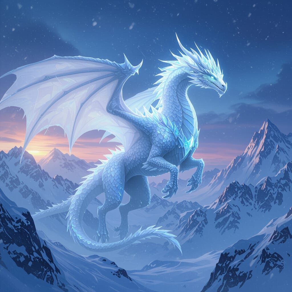 A majestic ice dragon soars through a blizzard. Its scales shimmer with white and blue hues, its mane a crystalline ice shard. Desolate snow-covered mountains stretch under a twilight sky, in a cinematic, epic fantasy style.